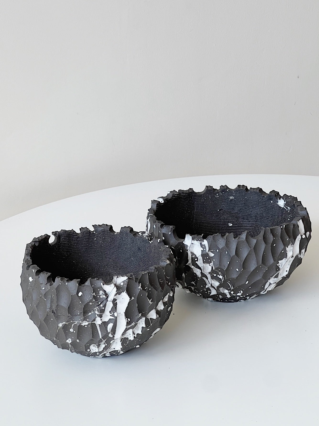 Thirty-three clays is a small batch contemporary pottery studio created by He. The Chinese local artist applied the art and graphic design background to explore carving ceramics. Each and every piece is uniquely handcrafted. As time passes by and natural hand motions flow, the organic components of the texture are revealed gradually. To keep the perfect imperfection from the raw material and processing, most pieces stay in the natural color of the clay and are unglazed, while some are highlighted slightly with splashes or metallic paint.