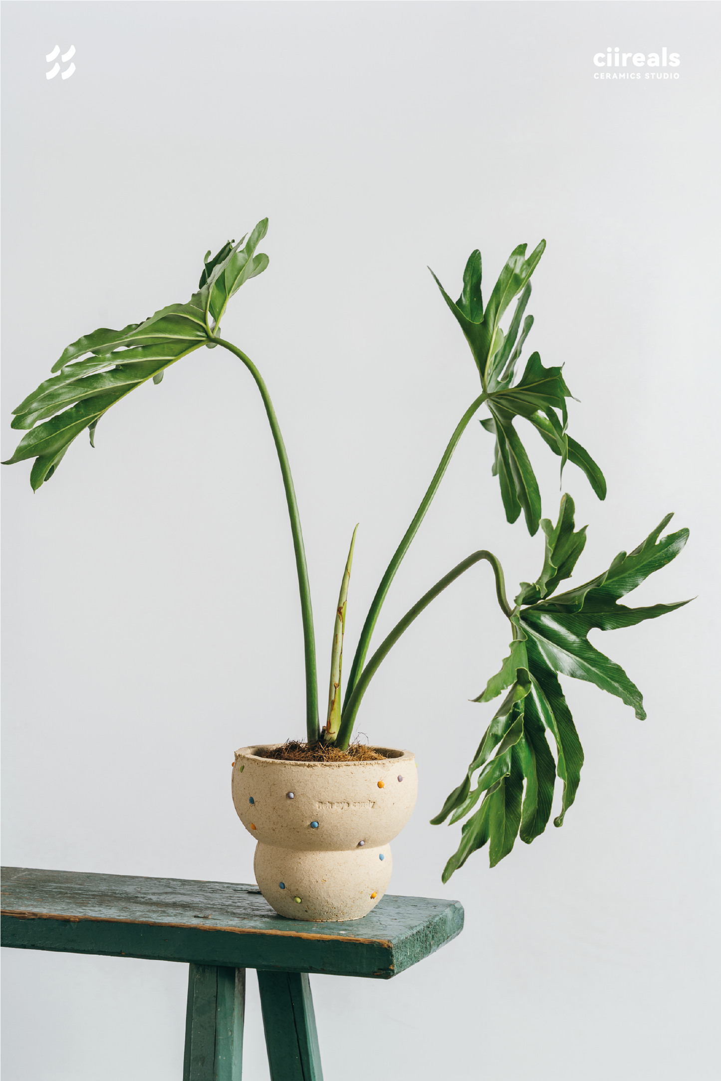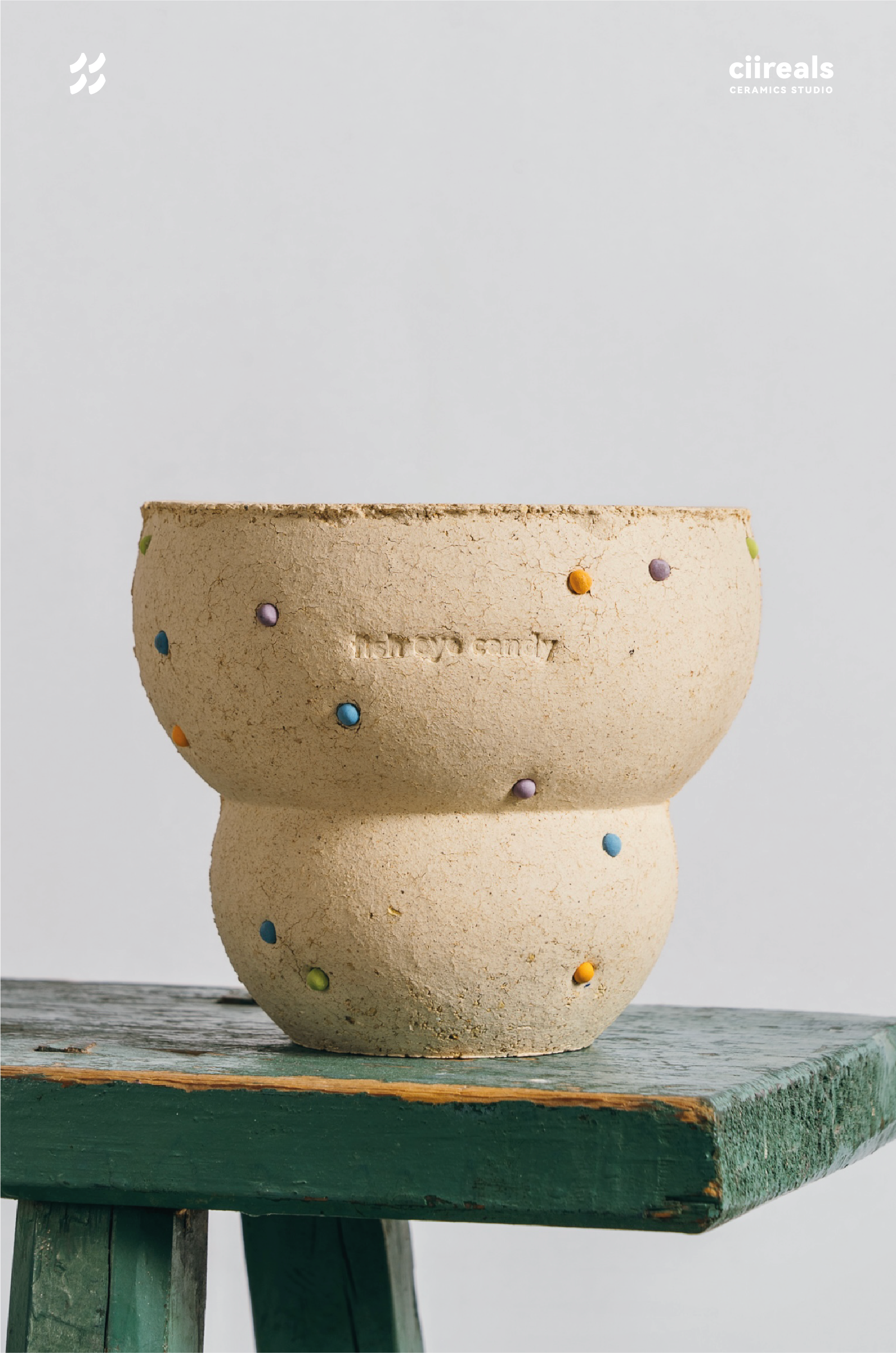 The "Fish-Eye Candy" planter is ciireals' debut product, drawing inspiration from the joy of childhood candies. Its signature crisp rim clearly showcases the mix of materials in the clay, while small hand-rolled clay "beads" add a whimsical touch. The planter's body, with a texture reminiscent of crushed peanut cookies, gives it a distinct and delightful "feel" to the eye, a rich texture that makes this piece unique.